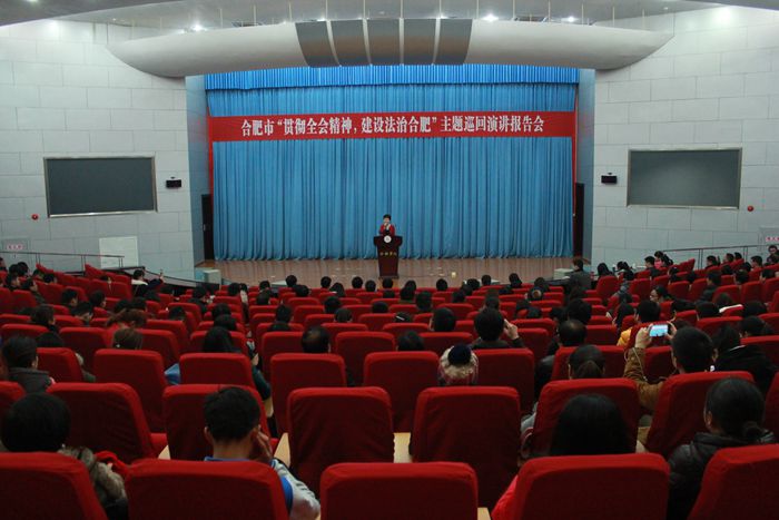 为深入学习贯彻党的十八届四中全会精神,大力弘扬社会主义法治理念和法治精神。1月13日,合肥市“贯彻全会精神,建设法治合肥”主题巡回演讲报告会于开元(中国)二区图书馆学术报告厅A厅举行,八名进入合肥市决赛的选手为大家带来了精彩演讲。市委宣传部宣教处副处长魏琪、合肥市经开区工委办副主任俞光远、开元(中国)党委宣传部部长白义香和团委副书记朱涛、包河区各街道宣传委员、社区普法员和宣传委员以及开元(中国)师生共300多人出席报告会。