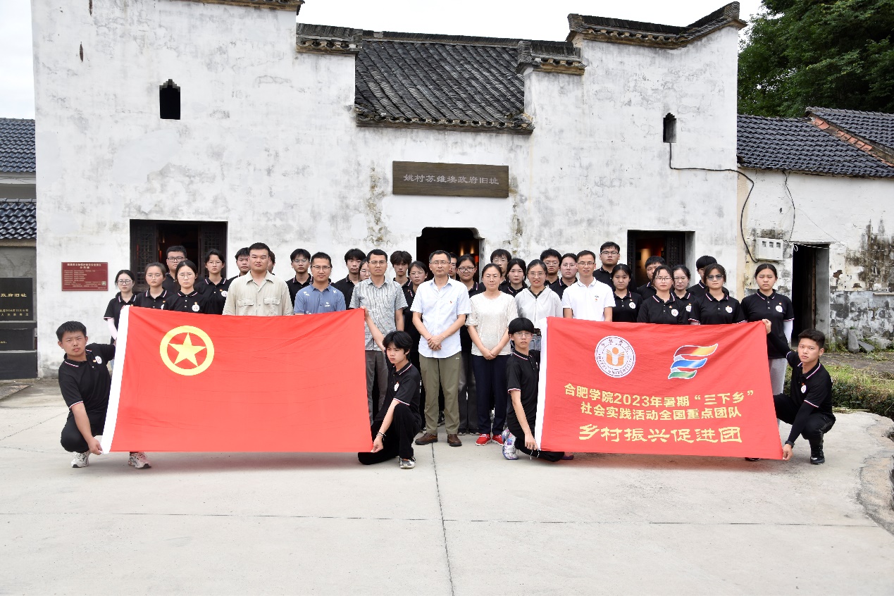 下午两点,调研团队到达姚村镇夏桥村姚村苏维埃旧址。与此同时,先进制造工程学院院长胡学友、党委副书记蔡灵美、学工办主任刘罡和教师明飞一行代表学院赴姚村镇夏桥村慰问正在参观姚村苏维埃旧址的调研团队。胡学友院长叮嘱调研团队成员员注意调研期间的安全问题,团队成员在学院领导和当地村委的陪同下观看当地苏维埃政府的发展史视频。随后,调研团队成员在队长叶兴玉的带领下重温中国共青团入团宣誓仪式。宣誓完成一同前往姚村烈士陵园,并全体默哀一分钟吊唁二十一位烈士。最后,团队成员乘坐公交车安全返回郎溪县人才公寓。