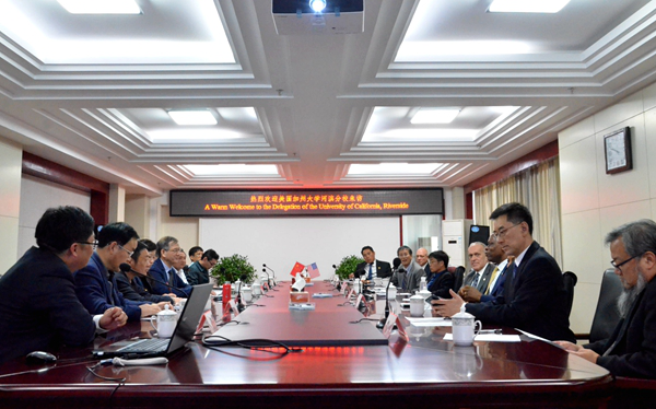 On March 28th, the delegation of University of California Riverside (UCR), headed by its chancellor Kim Wilcox, are warmly welcomed by Wang Qidong, president of HFU.