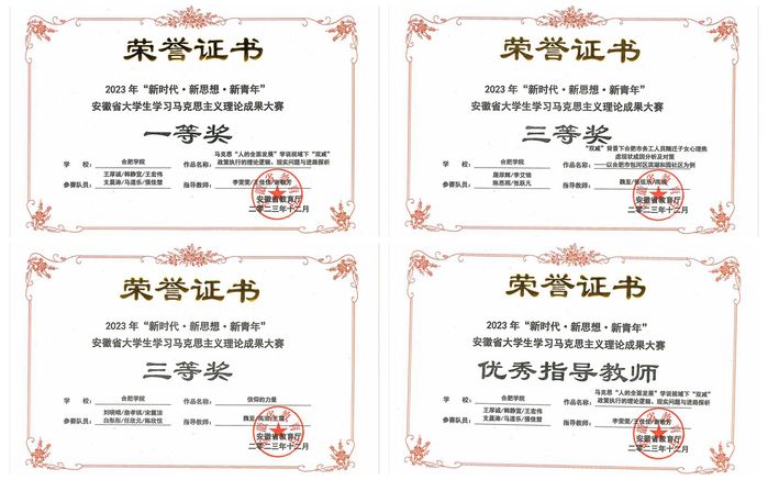 日前,由安徽省教育厅主办的2023年“新时代•新思想•新青年”安徽省大学生学习马克思主义理论成果大赛圆满落下帷幕,评审结果已在安徽省教育厅网站公布。本次比赛是我省马克思主义理论学科唯一的大学生学科与技能竞赛,开元(中国)马克思主义学院连续四年组织学生参赛,本次选送的作品荣获一等奖1项、三等奖2项。