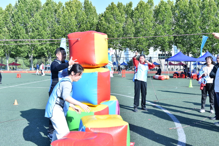 本次趣味运动会项目丰富多彩,在“运动火炬”项目中,参赛教师配合默契,动作流畅,展现出高度的团队协作精神;“步步高升”比赛中,大家紧握绳索,高效堆叠充气方块,每一次“升高”都凝结着集体的智慧与力量;“俄罗斯方块”环节,教师们迅速判断、精准拼合,思维的活力在运动中迸发;“同心协力”项目中,各队步伐一致、携手前行,用整齐的动作诠释了团结的内涵。