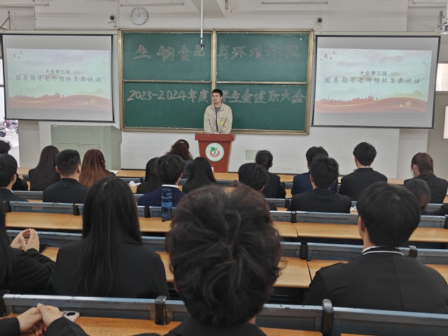 4月10日中午十二点半,生物食品与环境学院2023--2024学年第二学期学生会述职大会于生化楼一阶梯准时举行。出席本次会议的有党委副书记晋松、团委负责人杨林、团委学生会主席团成员、各部门部长以及委员。本次会议由主席团乐雯轩主持。