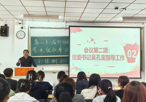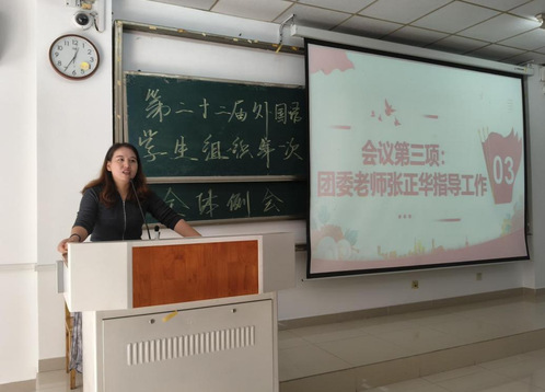 10月18日12时10分 ,外国语学院于5-101教室召开第二十二届学生组织全体学生例会。本次大会由执行主席陈露主持,院党委书记吴孔宝、团委副书记张正华莅临指导。