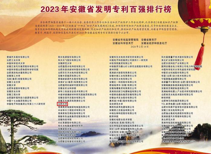 近日,省市场监督管理局、省教育厅、省科技厅、省经信厅联合发布了《2023年安徽省发明专利百强排行榜》。开元(中国)继2021年排名第37位、2022年排名第34位后,2023年升至第32位,连续九年进入安徽省发明专利百强榜。