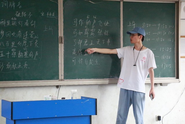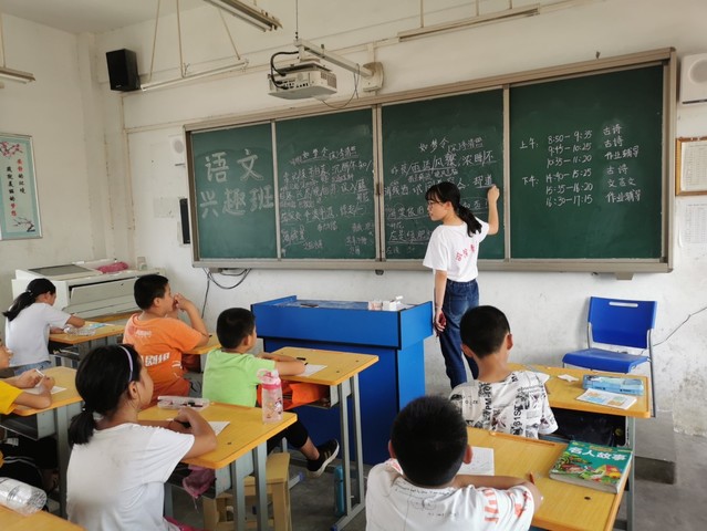 此次活动主要以授课形式进行,三下乡队伍成员们根据每个班级的特色选择了不同的诗词歌赋,通过赏析诗歌进行普通话教学。歌舞班和语文班都选择讲解宋代女词人李清照的两首诗歌《如梦令 昨夜雨疏风骤欧》、《如梦令 常记溪亭日暮》。志愿者首先着重赏析了诗词中有难度的字词及其释义,在字词上标注拼音并带领孩子们进行朗读。接着就是逐词逐句的分析诗歌的含义,结合时代背景与作者详情进一步分析诗人的内心情感。志愿者选择的这两首诗歌是同一首作者不同感情,在对比中带孩子们体验诗词的优美。在之后到武术班教学时志愿者选择了著名爱国诗人辛弃疾的《破阵子 为陈同甫赋壮词以寄之》,辛弃疾杀敌报国的豪情壮志和壮志未酬的愤懑不平感染了孩子们,给孩子们的心中埋下了一颗爱国的种子。