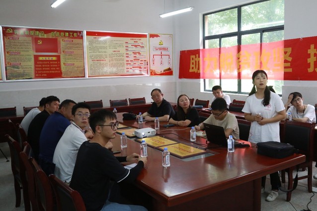 随后,领导们顶着烈日来到会议室召开会议。会议伊始,由“三下乡”实践活动负责人吴成晨通过PPT的形式进行支教工作汇报,她表示,本次的支教活动以“推普脱贫攻坚”为主题,并介绍了志愿者的日常工作以及摄影小课堂,安全知识讲座等特色活动。接着,由各位领导一一发言。董承军表示,今年由于疫情,水灾的情况,将支教人数压缩到往年的一半,但是志愿者们的工作却丝毫不懈怠,这让他感到很欣慰,更让他开心的是很多外地的学生也积极参加本次活动。杜娟提出可以让志愿者们征集周围人民意见,开展有针对性地课堂,同时也可以考虑跨学院合作,使教学科目更加丰富。同时,团委的领导们也志愿者们表达了由衷的赞许和敬佩,表示这将是一次弥足珍贵的回忆。至此,本次会议圆满结束。